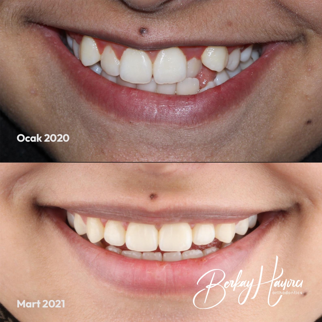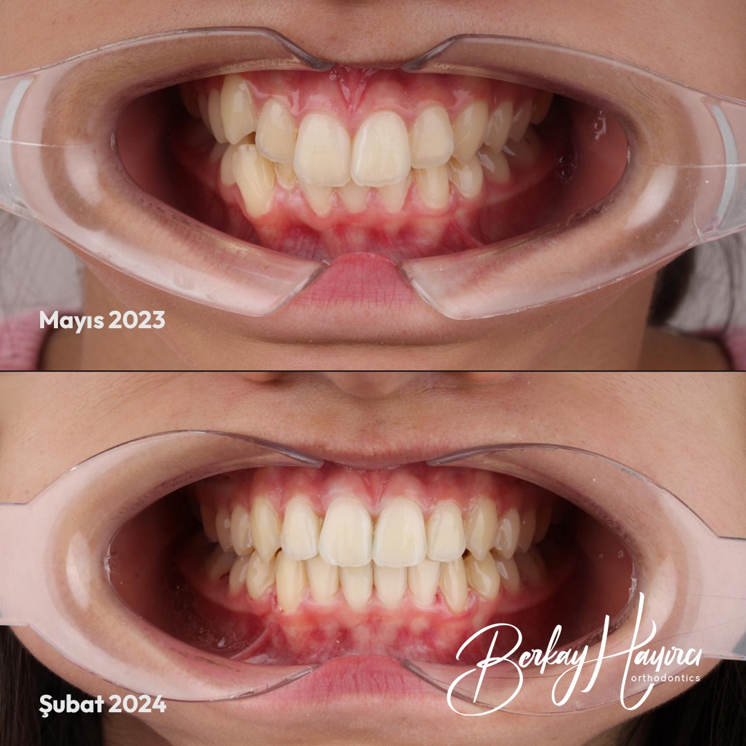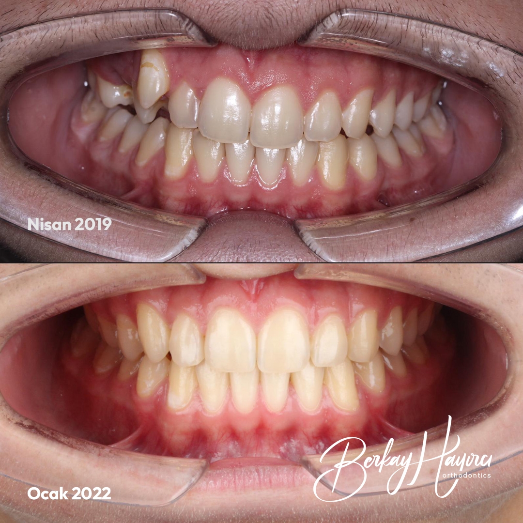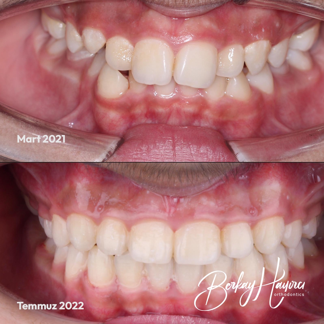 Şeffaf Plak Tedavisi ile Derin Kapanış ve Alt Çene Geriliğinin Düzeltilmesi (12 Yaş Erkek Hasta)12 yaşındaki erkek hastamız kliniğimize dişlerinin arasındaki boşluk ve estetik şikayetlerle başvurdu. Yaptığımız klinik muayene ve dijital tarayıcılarla 3d modelleme analizi ile alt çenesinin geride ve örtülü kapanış olduğu, dişinin arasında boşluk olduğu ve dişlerinin eksen eğimlerinde normalden sapmalar olduğunu fark ettik. Yaklaşık 1 yıl süren invisalign şeffaf plak tedavisi ile hem derin kapanışı hem alt çene geriliğini sadece şeffaf plaklar kullanarak tedavi ettik. Hastamıza hem estetik bir gülüş hem de fonksiyonel olarak doğru bir çene kapanışı kazandırdık.