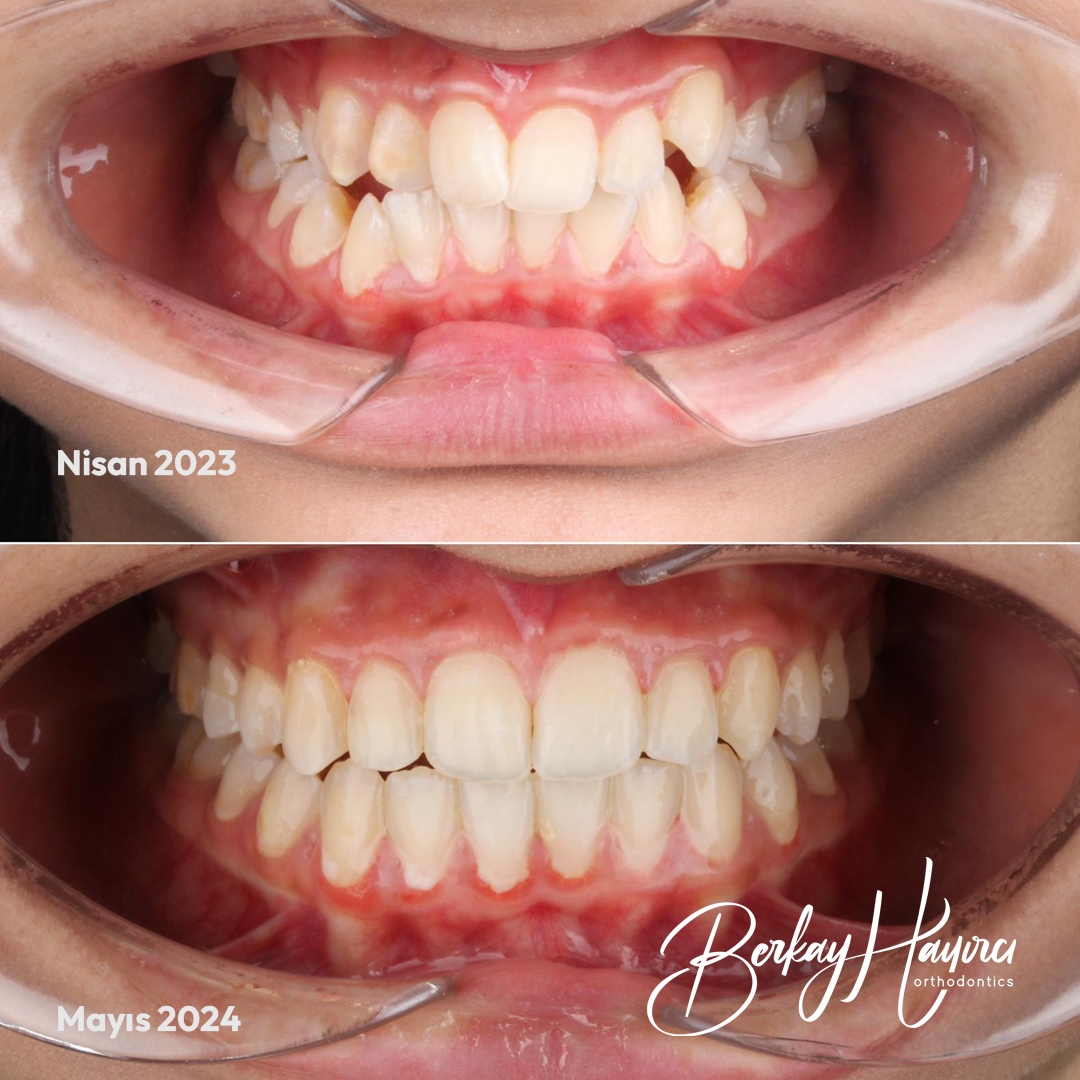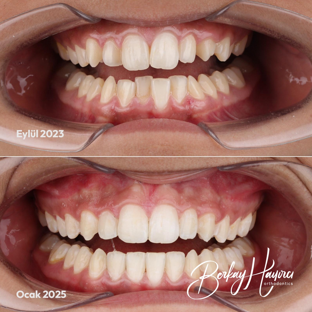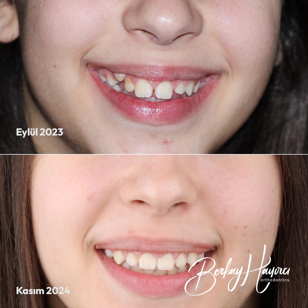 Şeffaf Plak Tedavisi ile Derin Kapanış ve Alt Çene Geriliğinin Düzeltilmesi (12 Yaş Erkek Hasta)12 yaşındaki erkek hastamız kliniğimize dişlerinin arasındaki boşluk ve estetik şikayetlerle başvurdu. Yaptığımız klinik muayene ve dijital tarayıcılarla 3d modelleme analizi ile alt çenesinin geride ve örtülü kapanış olduğu, dişinin arasında boşluk olduğu ve dişlerinin eksen eğimlerinde normalden sapmalar olduğunu fark ettik. Yaklaşık 1 yıl süren invisalign şeffaf plak tedavisi ile hem derin kapanışı hem alt çene geriliğini sadece şeffaf plaklar kullanarak tedavi ettik. Hastamıza hem estetik bir gülüş hem de fonksiyonel olarak doğru bir çene kapanışı kazandırdık.
