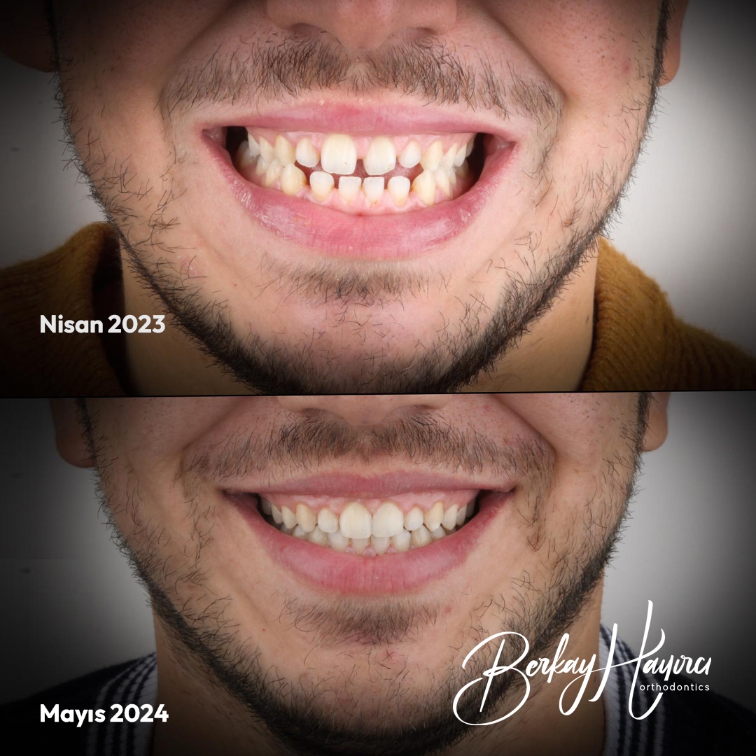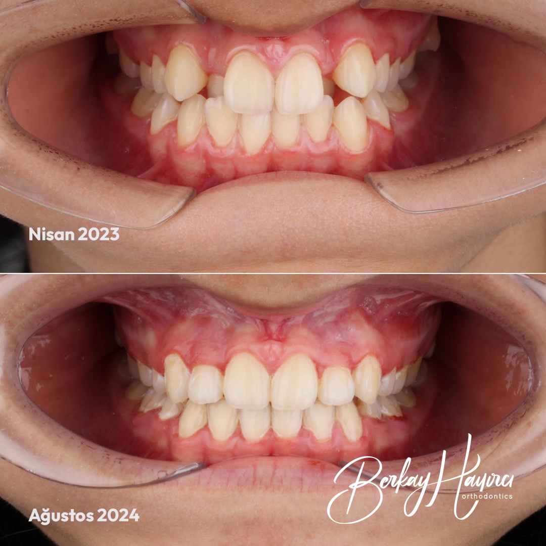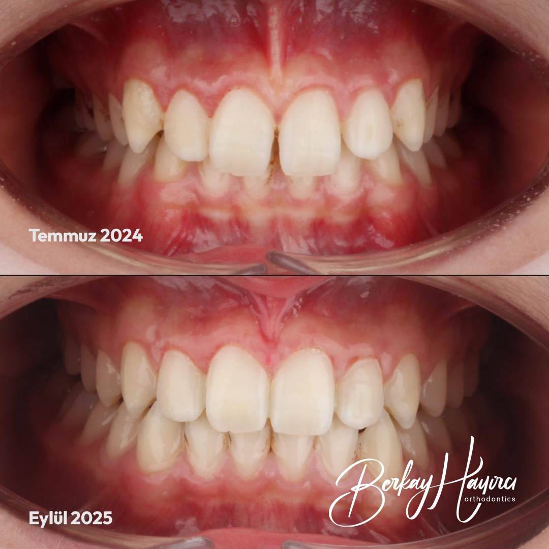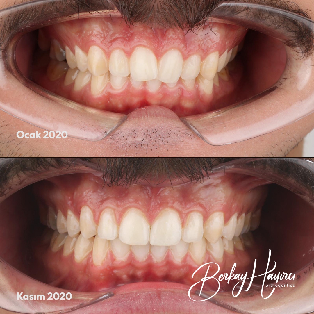 Şeffaf Plak Tedavisi ile Derin Kapanış ve Alt Çene Geriliğinin Düzeltilmesi (12 Yaş Erkek Hasta)12 yaşındaki erkek hastamız kliniğimize dişlerinin arasındaki boşluk ve estetik şikayetlerle başvurdu. Yaptığımız klinik muayene ve dijital tarayıcılarla 3d modelleme analizi ile alt çenesinin geride ve örtülü kapanış olduğu, dişinin arasında boşluk olduğu ve dişlerinin eksen eğimlerinde normalden sapmalar olduğunu fark ettik. Yaklaşık 1 yıl süren invisalign şeffaf plak tedavisi ile hem derin kapanışı hem alt çene geriliğini sadece şeffaf plaklar kullanarak tedavi ettik. Hastamıza hem estetik bir gülüş hem de fonksiyonel olarak doğru bir çene kapanışı kazandırdık.
