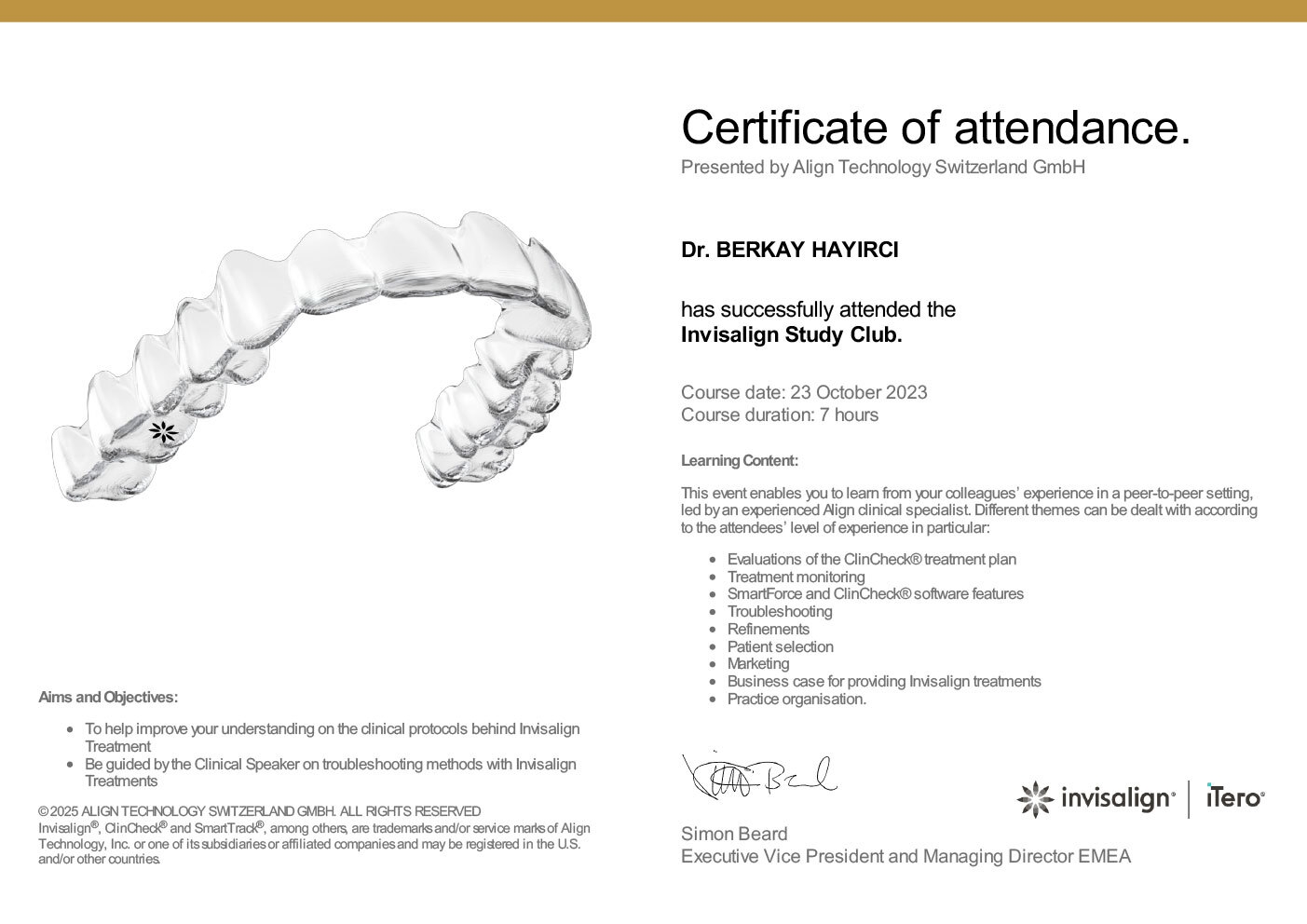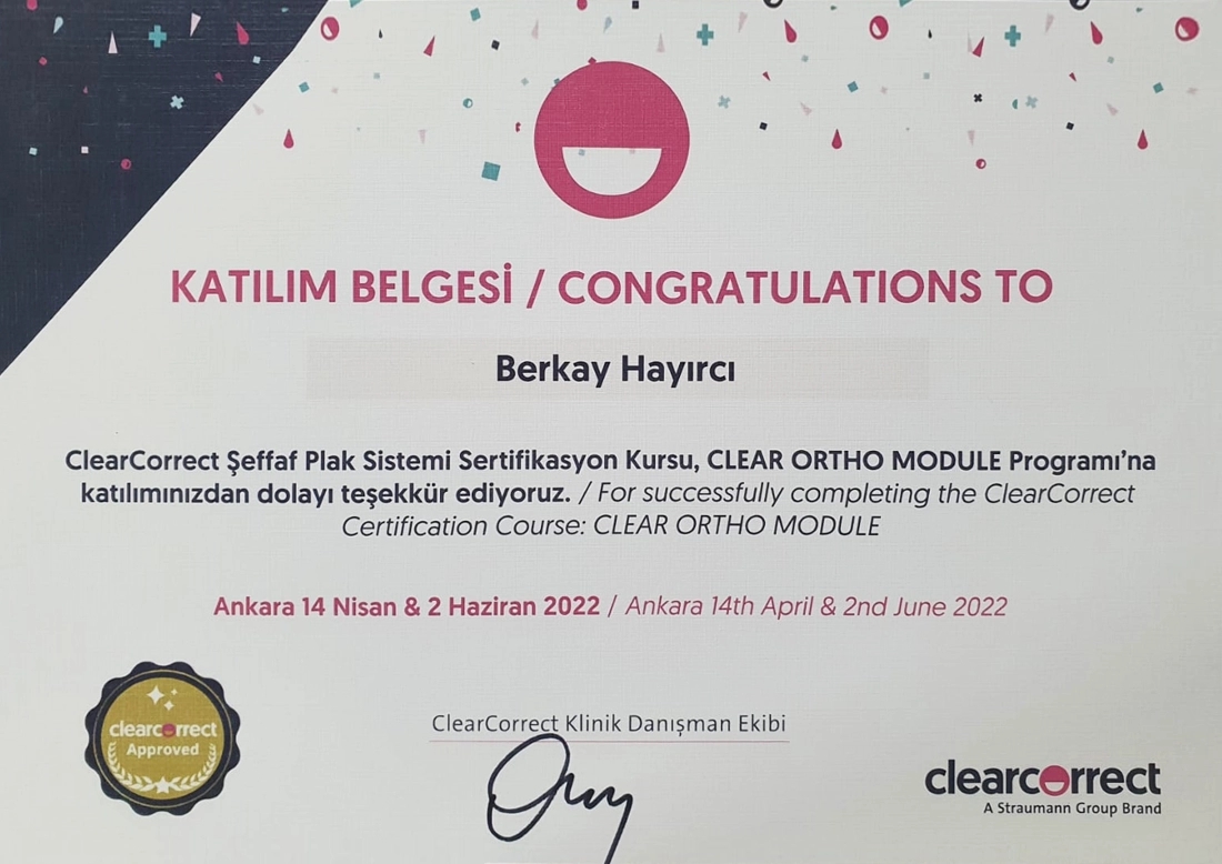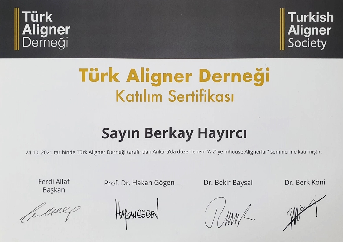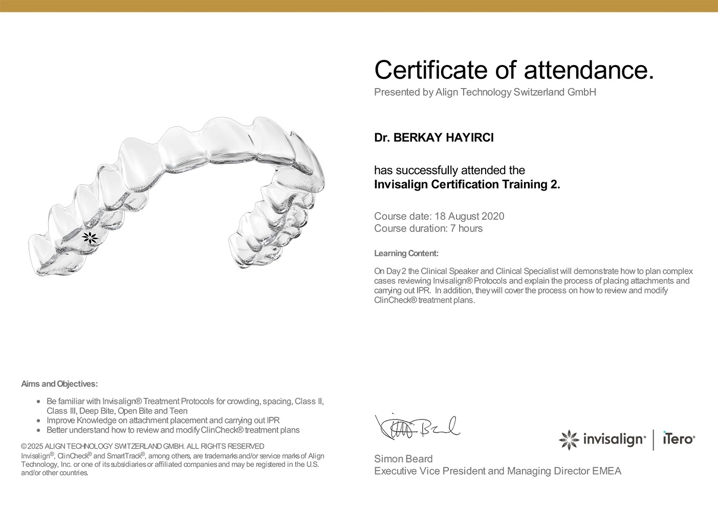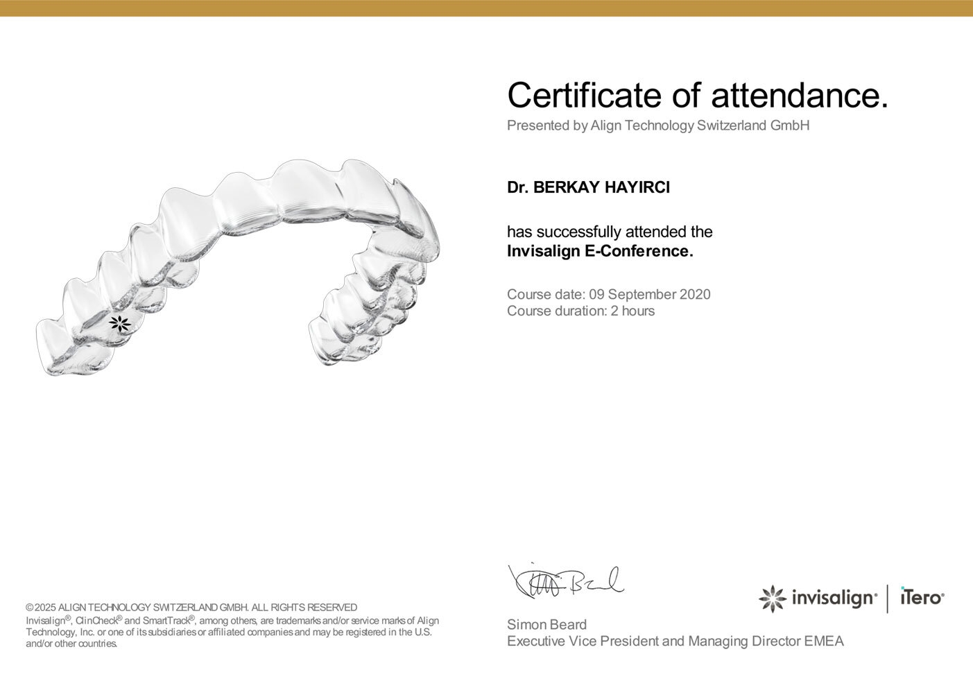 Uzm. Dt. Berkay Hayırcı, 2020 yılında Invisalign sertifika programını başarıyla tamamlayarak resmi olarak şeffaf plak (Invisalign) tedavileri uygulama yetkinliğine sahip olmuştur.