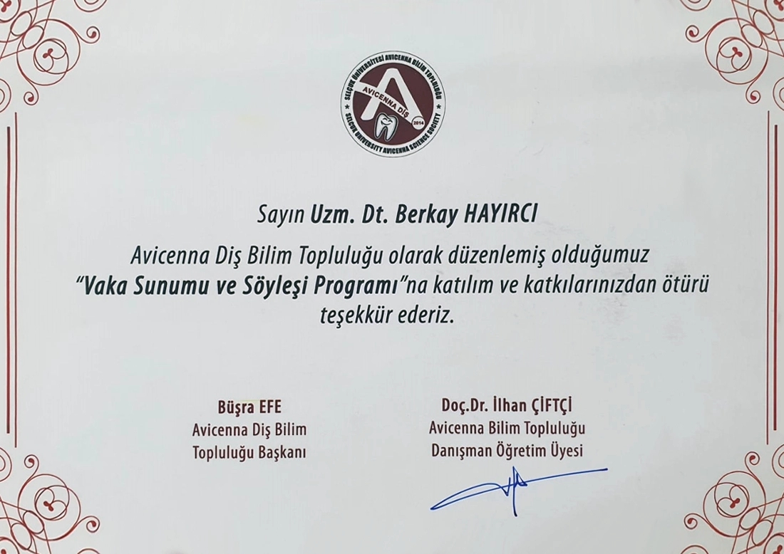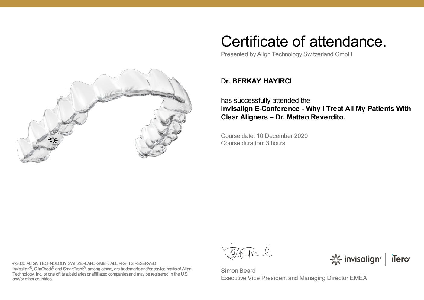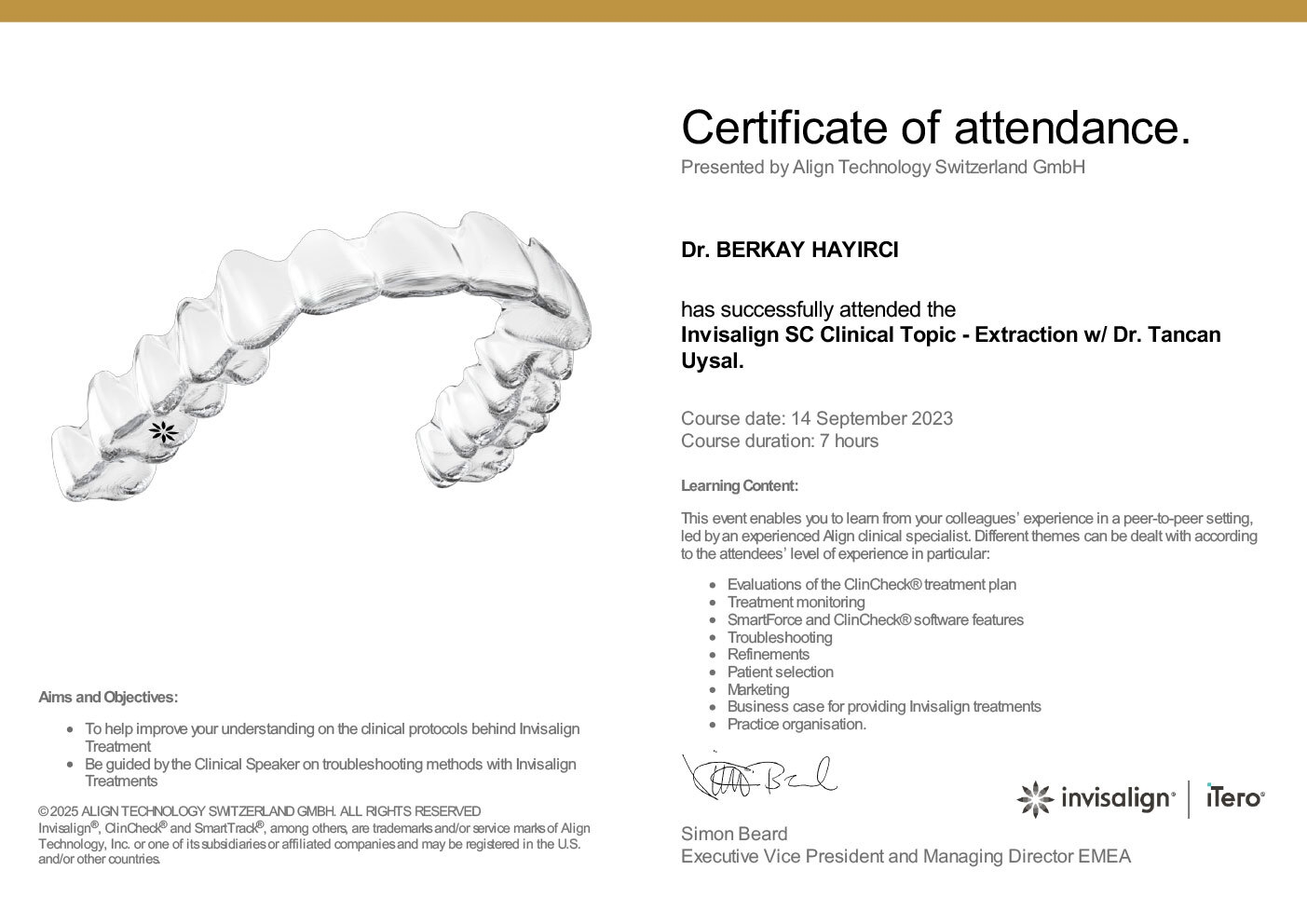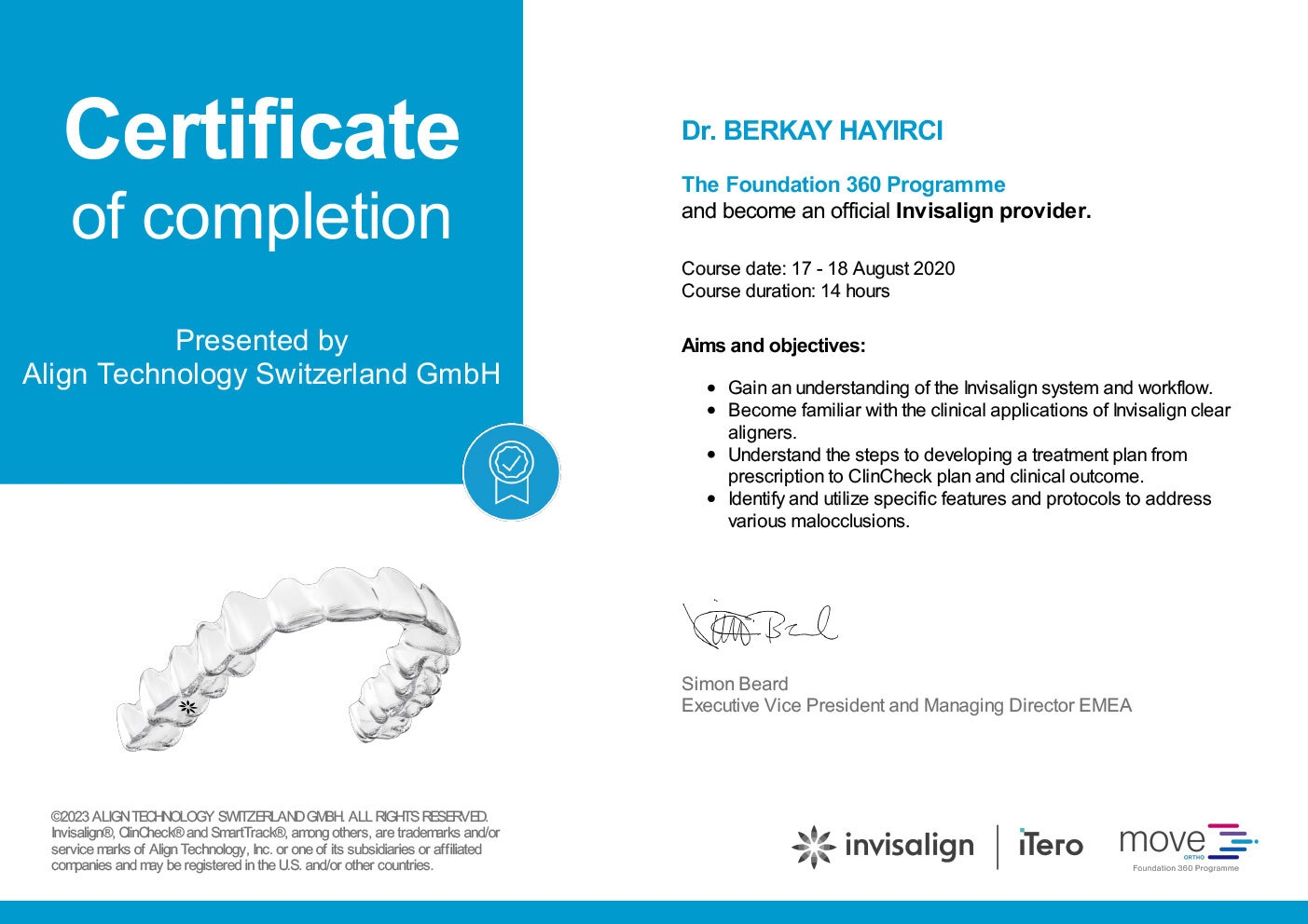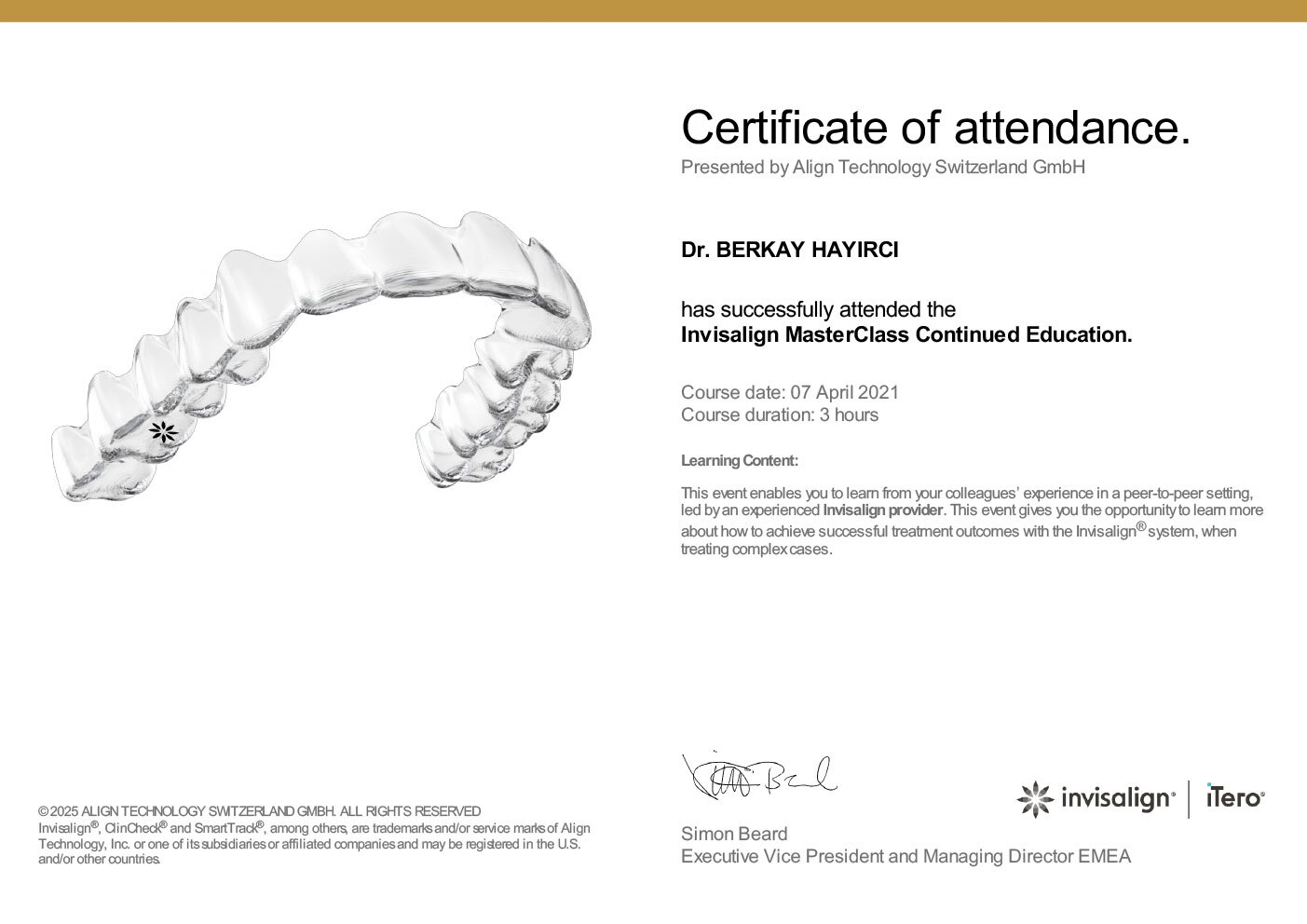 Uzm. Dt. Berkay Hayırcı, 2020 yılında Invisalign sertifika programını başarıyla tamamlayarak resmi olarak şeffaf plak (Invisalign) tedavileri uygulama yetkinliğine sahip olmuştur.